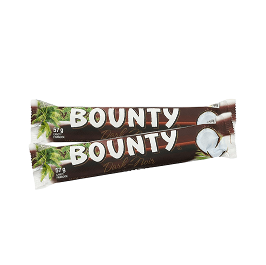 Bounty Dark made with sumptuous moist coconut, wrapped in 75% dark chocolate. BOUNTY® Dark Bar comes wrapped in two individual halves to either share with friends or enjoy all by yourself. 24 bars per box. You can find more options in our Dark Chocolate Section or Effem – Mars Section.