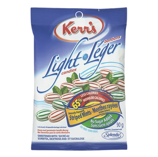 Kerr’s Light Candy Striped Mints individually wrapped and naturally flavoured mints with 65% less calories. No sugar added and fat free but retaining the flavor and freshness of other mint candies. The mints do not promote tooth decay. Sugar Free Candy – Manufactured in a Peanut/nut Free Facility. Visit our Allergy Free Section or Kerr Section for more options.